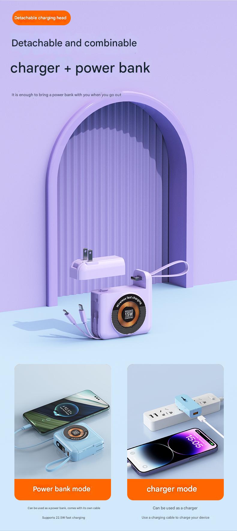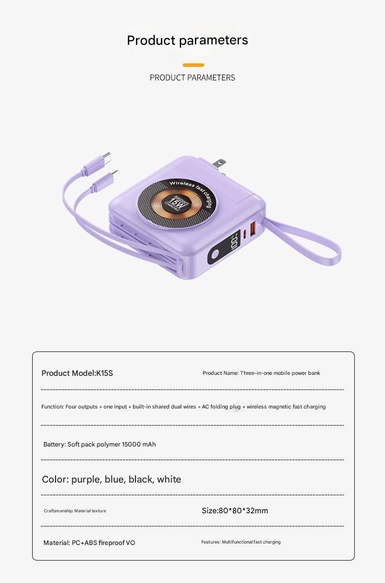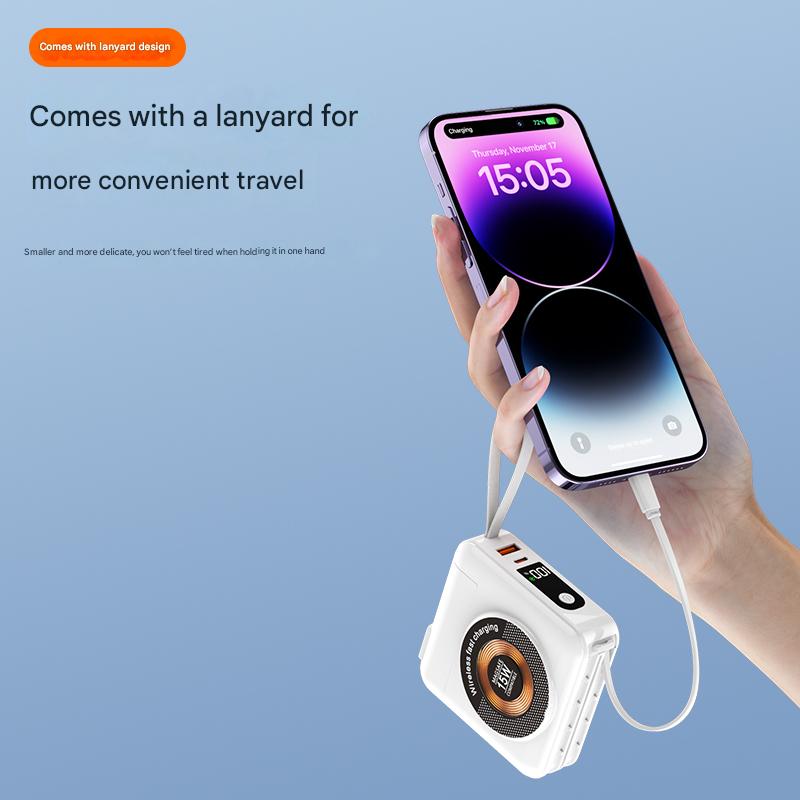 15000 mAh 3-in-1 Power Bank.20W PD Fast Charging, 15W Magnetic Wireless Charging And 12W Detachable Plug For Charging Your Phone Or Power Bank Separately.Design With A Built-in Lanyard.