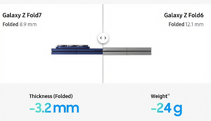 - Z Fold7: Unfolded: 4.5mm (vs Fold6’s 5.6mm), folded: 8.9mm (vs 12.1mm). Weight drops to 215g—lighter than iPhone 16 Pro Max (228g).